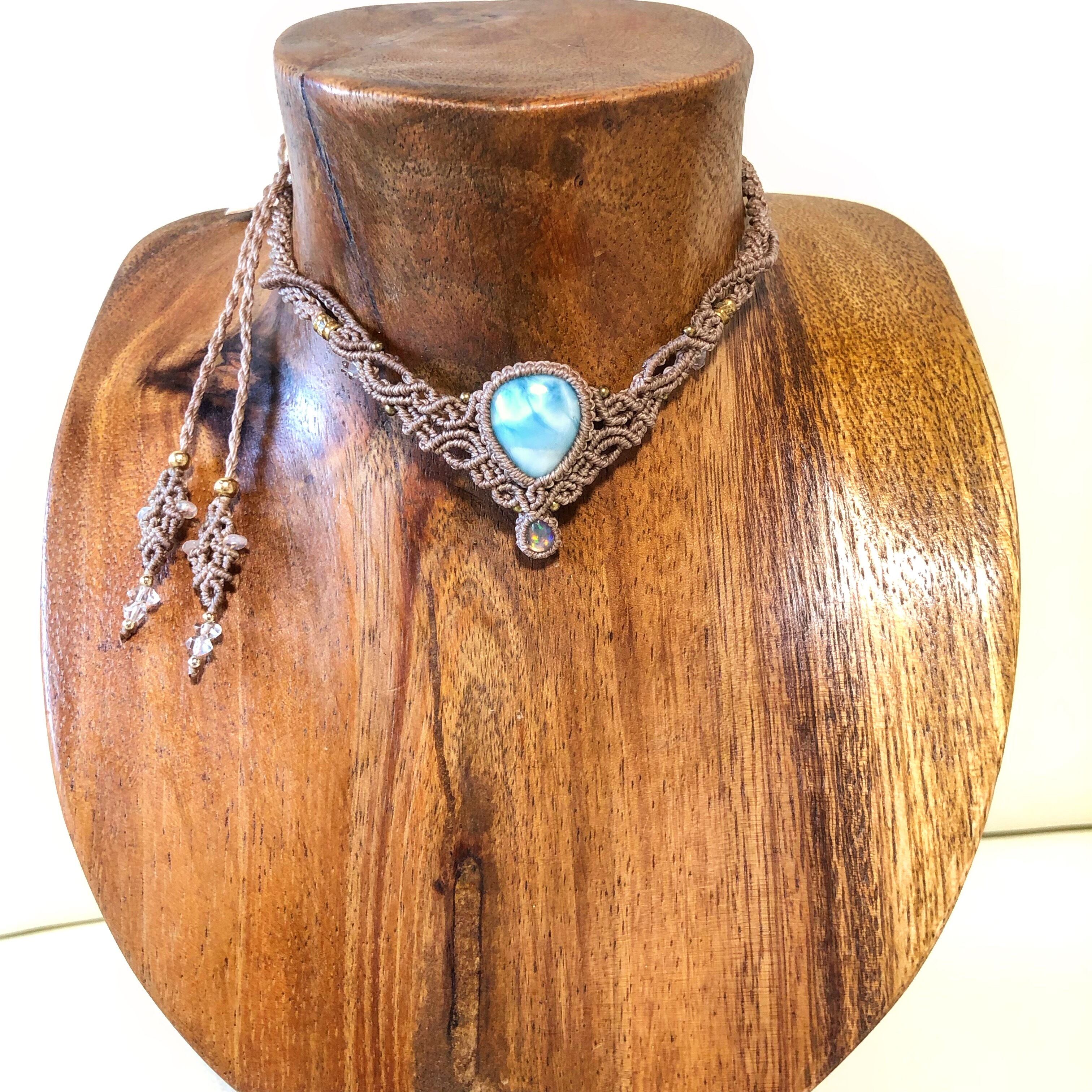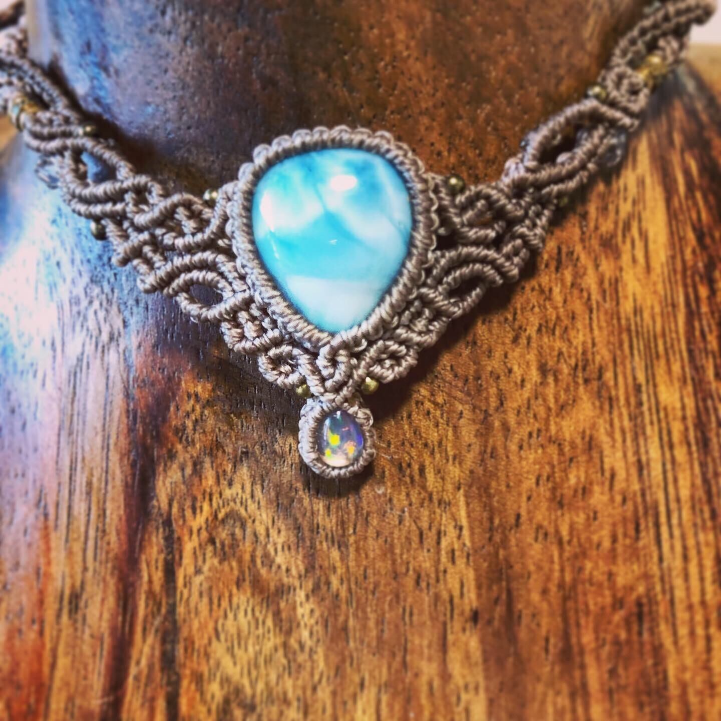 希少価値のあるラリマーをポイントにエチオピアオパールを組み合わせ、お姫様になれるようなクリーム色のコードで編んでみました。
