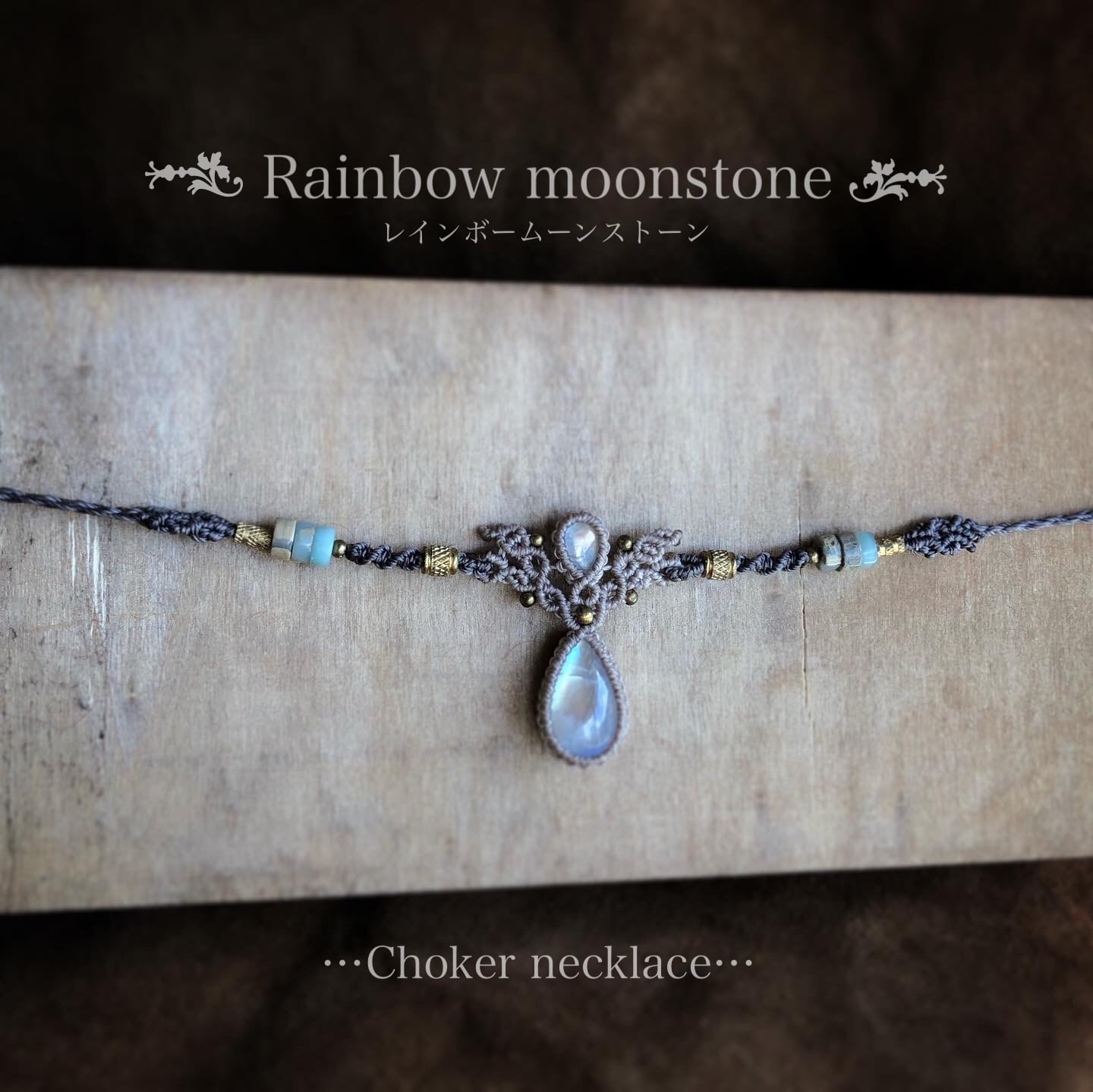 どの角度からも綺麗なシラーを魅せてくれるレインボームーンストーンを贅沢に2点使用したチョーカータイプのネックレスになります。