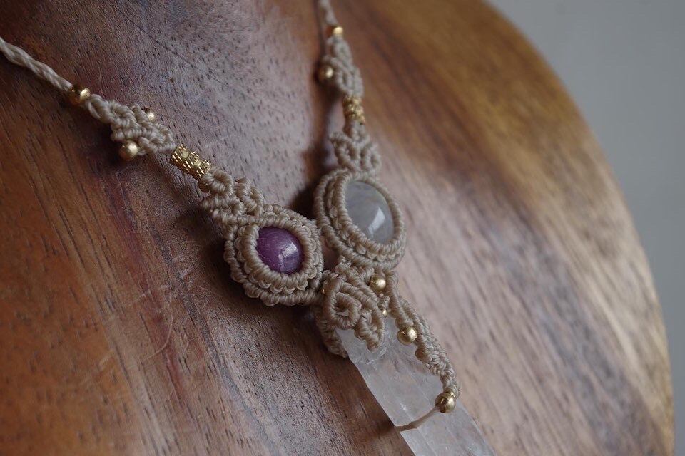 インド産レインボームーンストーンと高品質スタールビーを組み合わせリネンコード色で編み上げました。どこかお姫様のような仕上がりに…˚✧˚✧
