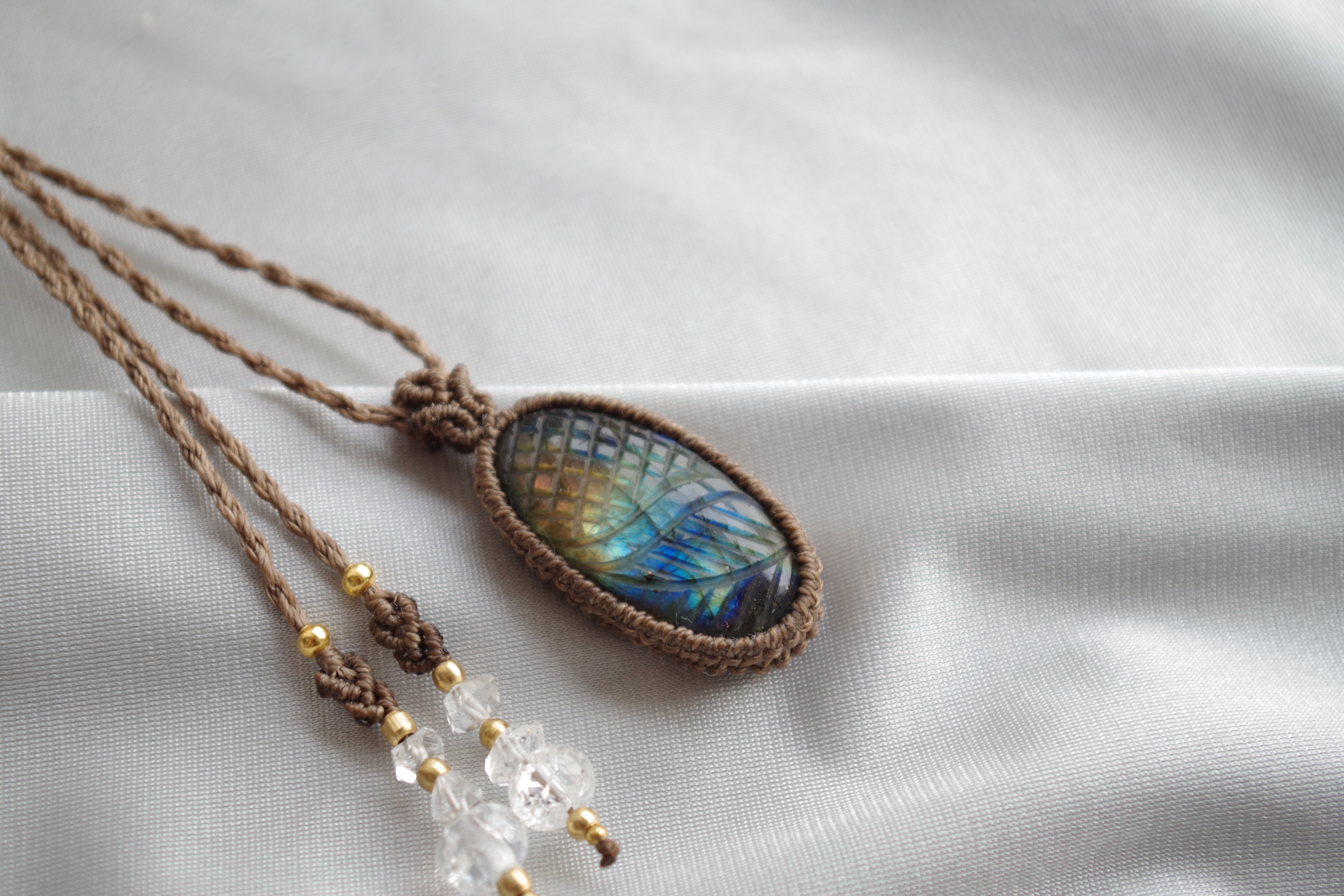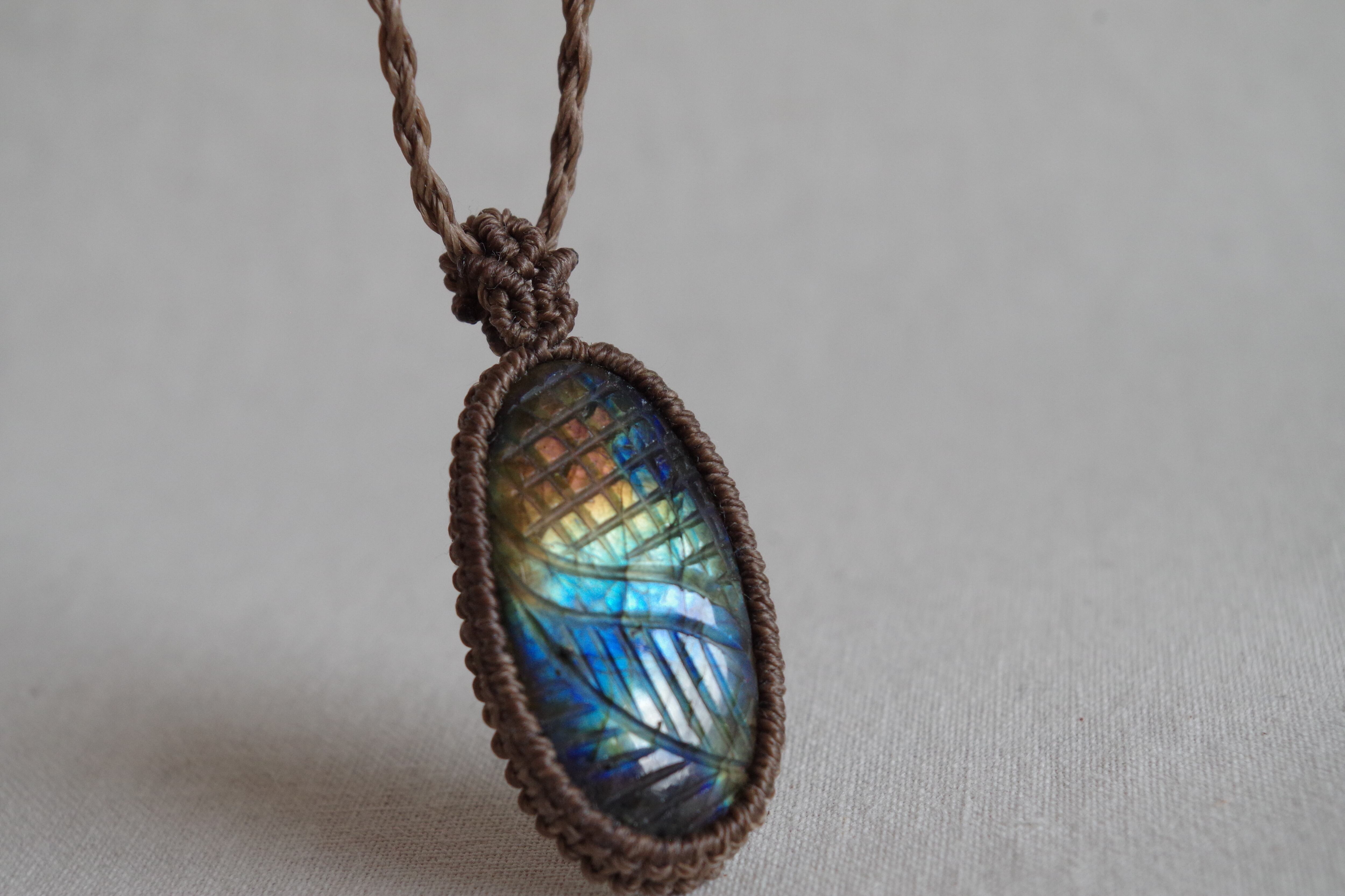 レインボーカラーのラブラドレッセンス(シラー)と繊細な彫刻が美しい一点です。