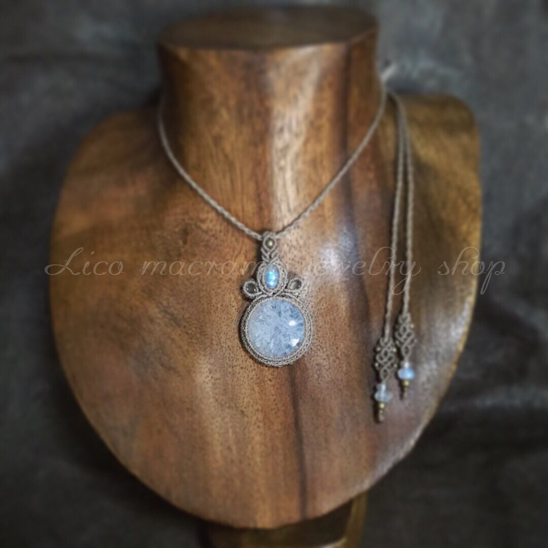 透明度が高く角度によって色んな表情を見せてくれるソーラークォーツに小粒ながらも存在感があるエチオピア産オパールとレインボームーンストーンを合わせ贅沢に編み込みました。